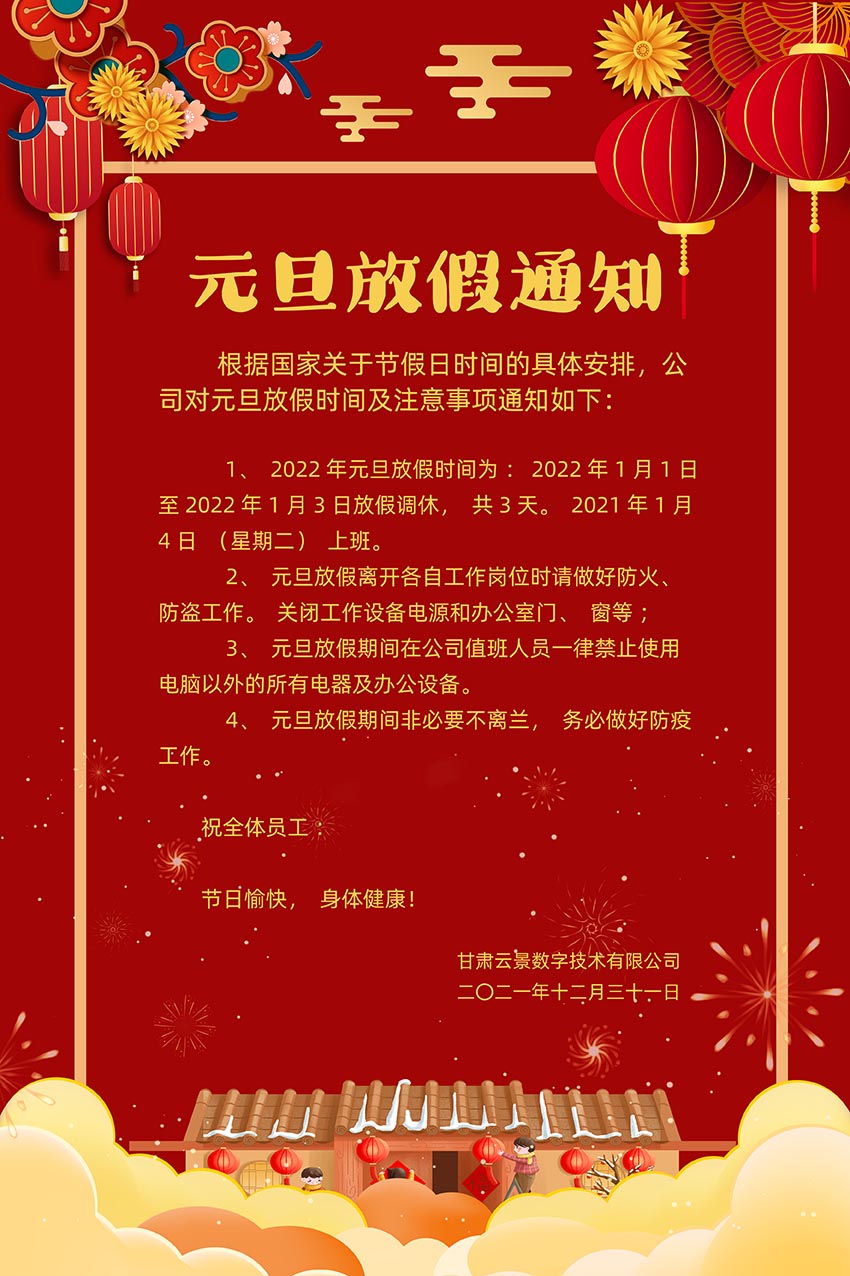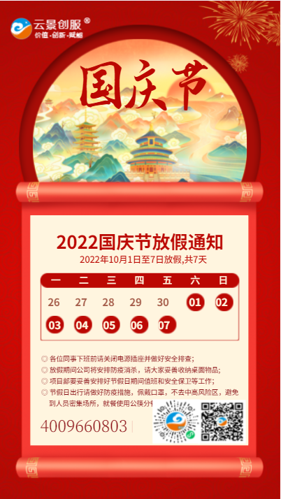 2022年甘肅云景數(shù)字技術(shù)有限公司國慶節(jié)放假通知及溫馨提示 根據(jù)《國務(wù)院辦公廳關(guān)于2022年部分節(jié)假日安排的通知》(國辦發(fā)明電〔2021〕11號)要求,2022年國慶節(jié)中心放假時間為2022年10月1日至10月7日放假,共7天。10月8日(星期六)、10月9日(星期日)正常上班。一、各部門自行妥善安排好 公告通知 2022年09月29日 138 點贊 0 評論 5183 瀏覽