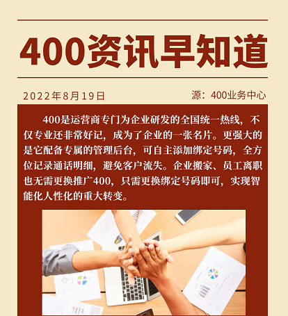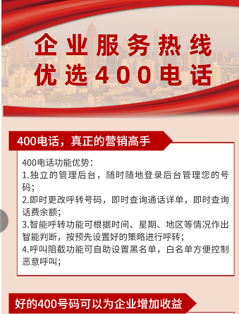 2022年9月5日 400企業(yè)服務(wù)熱線電話申請(qǐng)辦理優(yōu)質(zhì)號(hào)源推薦 一個(gè)好的400號(hào)碼是企業(yè)跳躍在廣告牌上的財(cái)富400電話為企業(yè)營(yíng)銷助力!提升企業(yè)形象,增加廣告回報(bào)?解決來(lái)電占線難題?讓客戶服務(wù)更規(guī)范?搬家不換號(hào)?精選400推薦>>>400-661-8888400-685-8888400-68 優(yōu)惠活動(dòng) 2022年09月05日 0 點(diǎn)贊 0 評(píng)論 2313 瀏覽