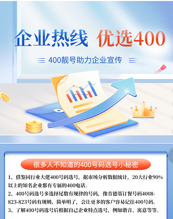 2022年8月12日 400電話申請辦理及企業(yè)400熱線電話優(yōu)質(zhì)號碼推薦信息 每一次努力,都是幸運(yùn)的伏筆。400電話,專業(yè)、專注幫助企業(yè)乘風(fēng)破浪。40099-111194008-222220400-093-5999400-826-7666超級優(yōu)質(zhì)靚號,活動(dòng)銷售價(jià)20000元/3年400-877-3555400-8767- 優(yōu)惠活動(dòng) 2022年08月12日 0 點(diǎn)贊 0 評論 2247 瀏覽