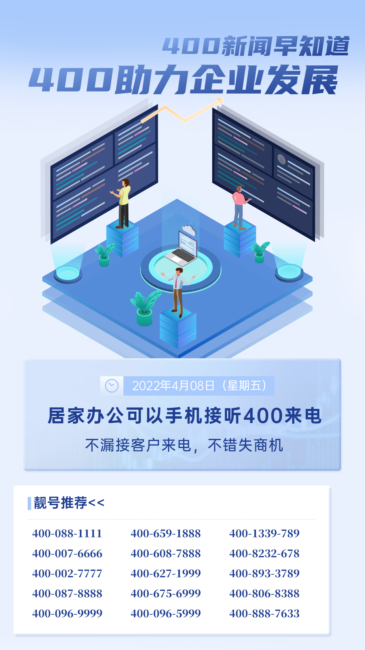 2022年4月8日 400電話優(yōu)惠號(hào)碼推薦 比疫情更可怕的是,你有了疫情的心態(tài)。拒絕消極心態(tài)。唯有迎難而上,才能迎刃而解。為可能,盡所能。400-007-6666400-002-7777400-087-8888400-096-9999集團(tuán)頂級(jí)靚號(hào),活動(dòng)銷售價(jià)168000元/3年400-6 優(yōu)惠活動(dòng) 2022年04月08日 0 點(diǎn)贊 0 評(píng)論 3772 瀏覽
