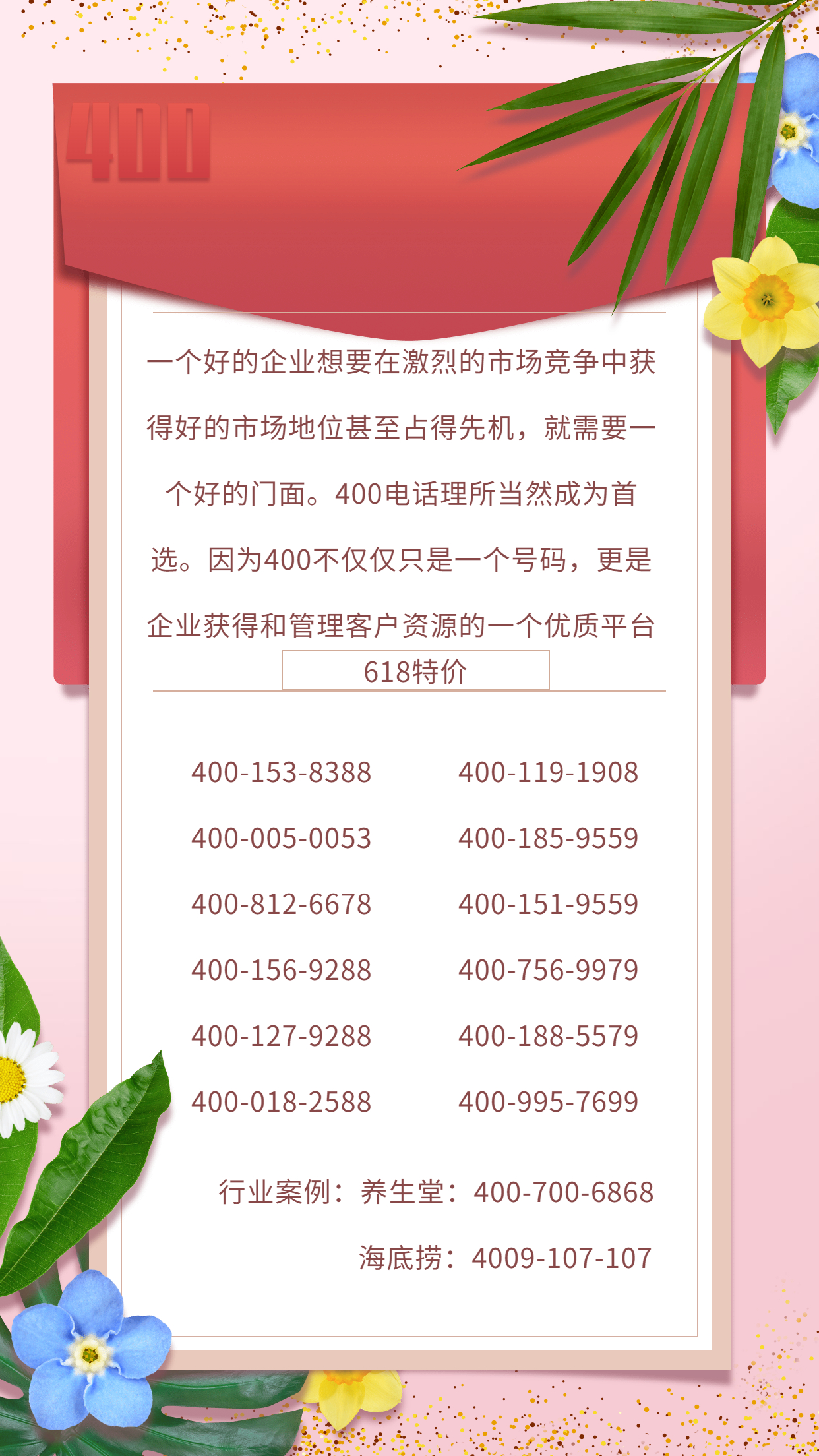 2022年6月15日 400電話申請(qǐng)辦理優(yōu)惠信息優(yōu)質(zhì)號(hào)碼推薦【618活動(dòng)開啟】 市場(chǎng)競(jìng)爭(zhēng)太強(qiáng)、產(chǎn)品種類繁多、客戶粘度不高?企業(yè)差異化戰(zhàn)略第一步!選擇400號(hào)碼,立刻提升您公司的品牌形象,拉開企業(yè)差距!小小成本,為您的企業(yè)創(chuàng)造無(wú)限的價(jià)值!<<<400今日精選>>>400-686-00004 優(yōu)惠活動(dòng) 2022年06月15日 0 點(diǎn)贊 0 評(píng)論 2565 瀏覽