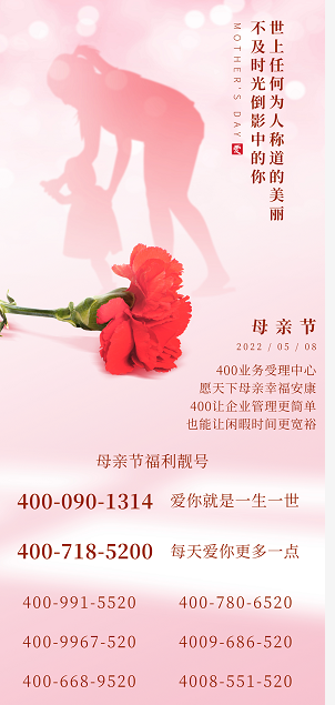 2022年5月8日 400電話優(yōu)質(zhì)號(hào)源加推 世上任何為人稱道的美麗,不及時(shí)光倒影中的你。400業(yè)務(wù)受理中心,愿天下母親幸福安康。母親節(jié)福利靚號(hào):400-090-1314愛你就是一生一世400-718-5200每天愛你更多一點(diǎn)更多愛你靚號(hào):400-991-5520400-9967-5204 優(yōu)惠活動(dòng) 2022年05月08日 0 點(diǎn)贊 0 評(píng)論 2782 瀏覽