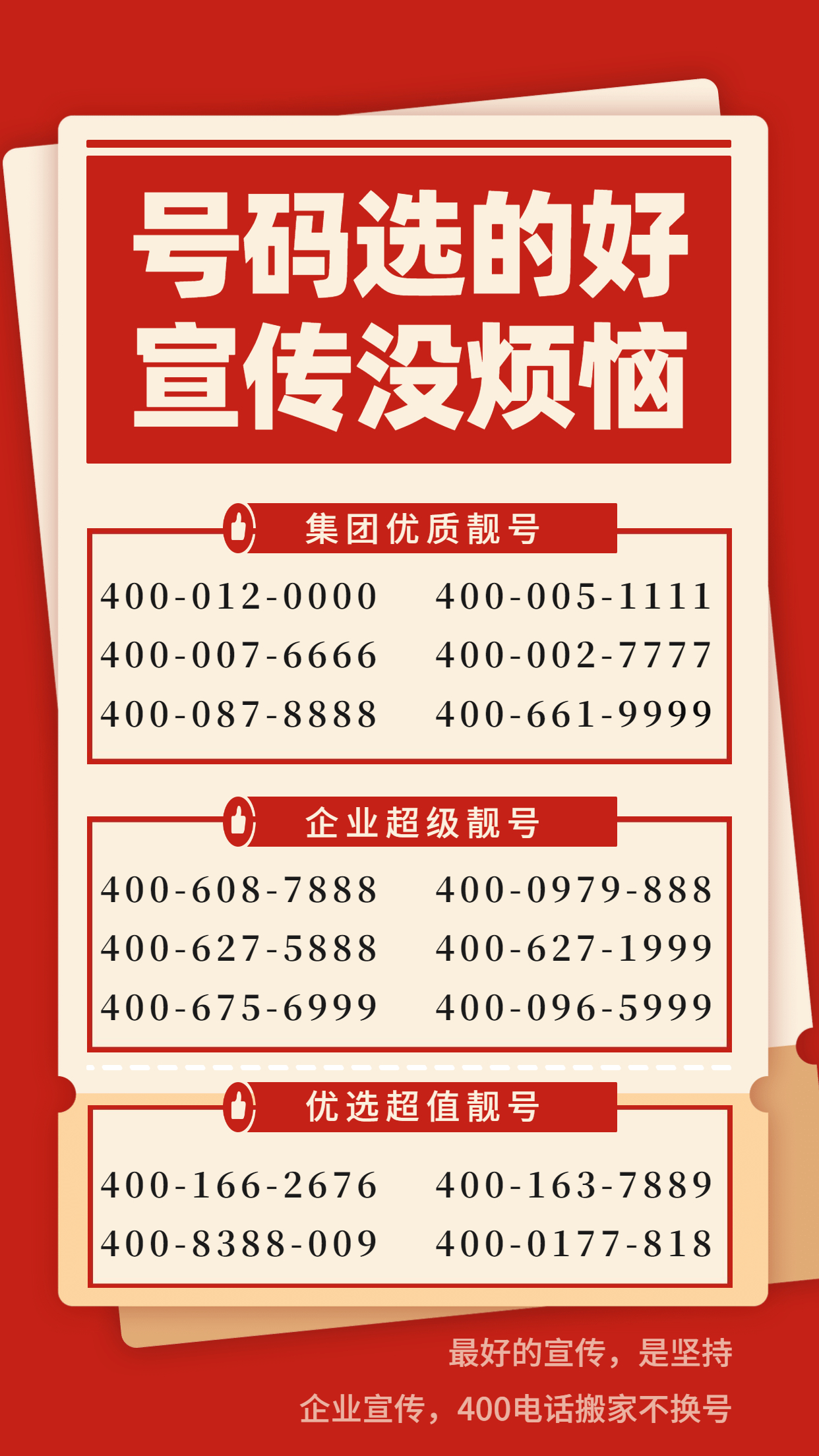 2022年4月11日 400電話靚號推薦 最好的宣傳,是堅持;“多年如一日”的堅持;換來“日久見人心”的認可;企業(yè)宣傳,400電話搬家不換號!<<<400今日精選>>>400-012-0000400-005-1111400-007-6666400-0 優(yōu)惠活動 2022年04月11日 0 點贊 0 評論 3459 瀏覽